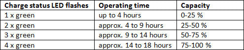 The first charging cycle takes longer (up to 16 hours) because it is used to determine the maximum capacity of the rechargeable batteries. The intelligent battery charging technology charges the rechargeable batteries both effectively and gently. After initial charging, a complete charging cycle takes up to 8.5 hours. During charging, the Charge status LED on the transmitter lights up red. When the rechargeable batteries are fully charged, the Charge status LED lights up green.